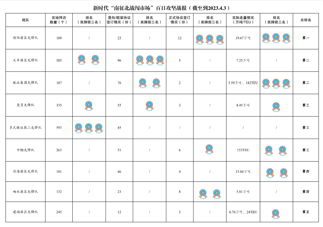 2.簽訂意向/框架協(xié)議數(shù)量473份:其中大豐港區(qū)先鋒隊96份,航運集團(tuán)先鋒隊76份,黨員先鋒隊55份,巾幗先鋒隊51份,濱海港區(qū)先鋒隊46份,多式聯(lián)運第二先鋒隊45份,多式聯(lián)運第一先鋒隊33份,射陽港區(qū)先鋒隊23份,響水港區(qū)先鋒隊23份,青年先鋒隊13份,建湖港區(qū)先鋒隊12份。