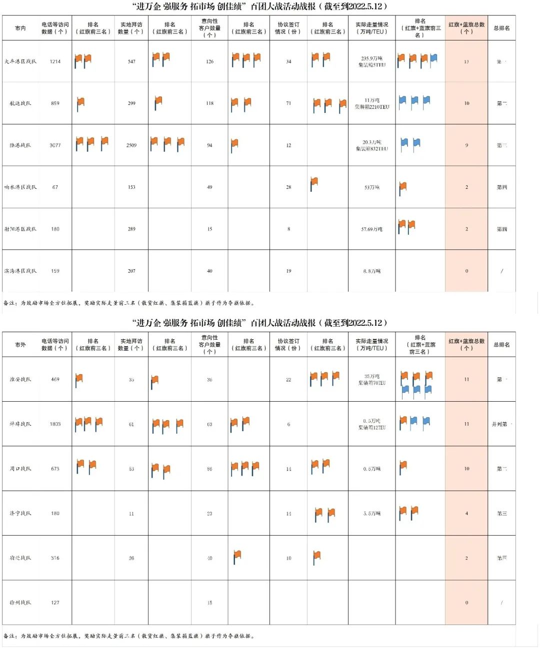 各戰(zhàn)隊(duì)累計(jì)拜訪客戶數(shù)據(jù)13314家,其中電話、視頻等訪問9124家,實(shí)地拜訪4190家,意向性客戶705家,簽訂協(xié)議238份,實(shí)際走量428.19萬噸、3129TEU。具體細(xì)分如下: