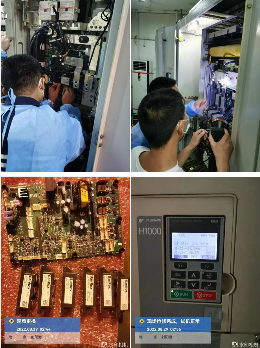 更換備件后,進行上電檢測,發(fā)現(xiàn)設(shè)備仍無法正常工作。維修團隊又繼續(xù)排查外部元器件,發(fā)現(xiàn)變頻柜主電源空氣斷路器、主電源接觸器的觸頭燒蝕。為空氣斷路器更換元器件后,又對設(shè)備反復(fù)進行上電測試,維修團隊持續(xù)奮戰(zhàn)到29日凌晨3點,直至試機正常。
