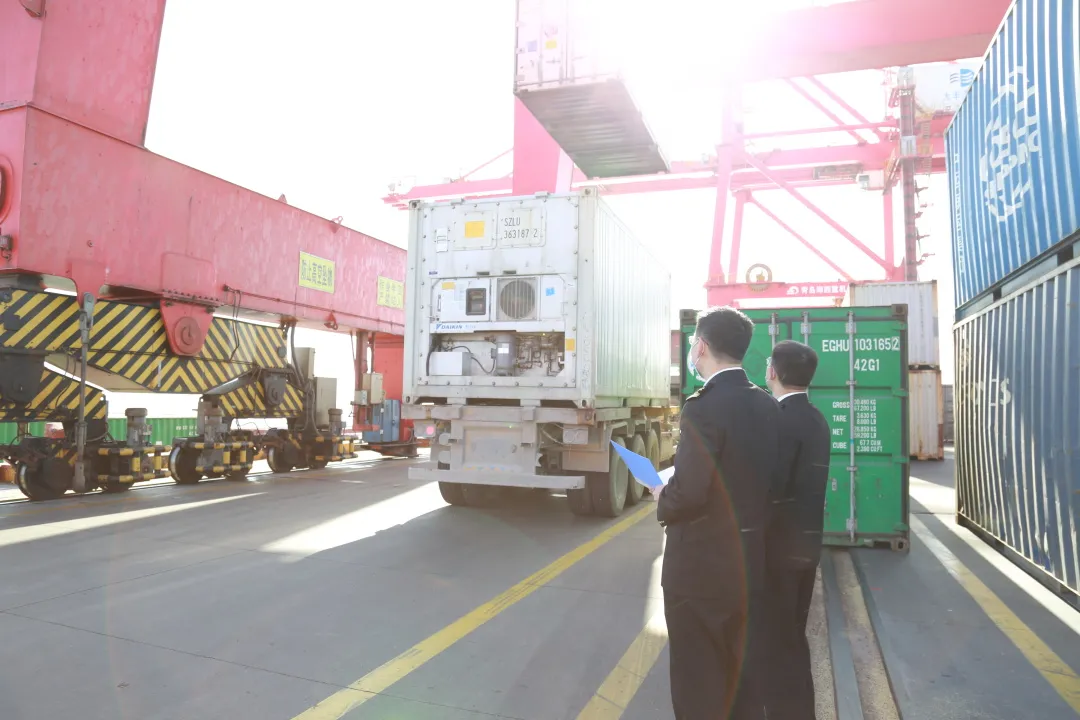 圖為:鹽城海關(guān)關(guān)員對(duì)“滬豐通”搭載的出口集裝箱貨物進(jìn)行監(jiān)管