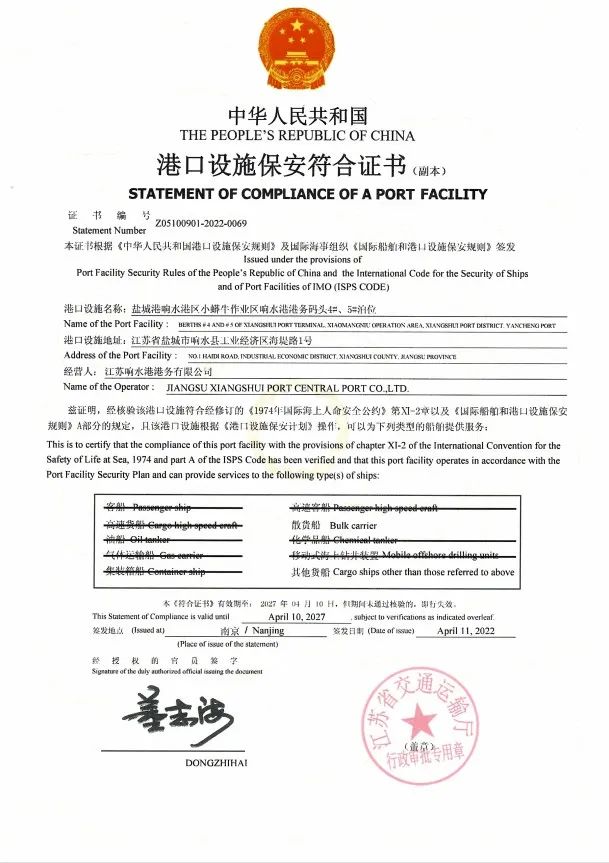 近日,在省、市相關部門、專家和咨詢單位的大力支持幫助下,響水港區(qū)、射陽港區(qū)10個萬噸級以上泊位順利獲得江蘇省交通運輸廳核發(fā)的港口設施保安符合證書,為響水港區(qū)、射陽港區(qū)一類開放口岸國家級驗收奠定了堅實基礎。