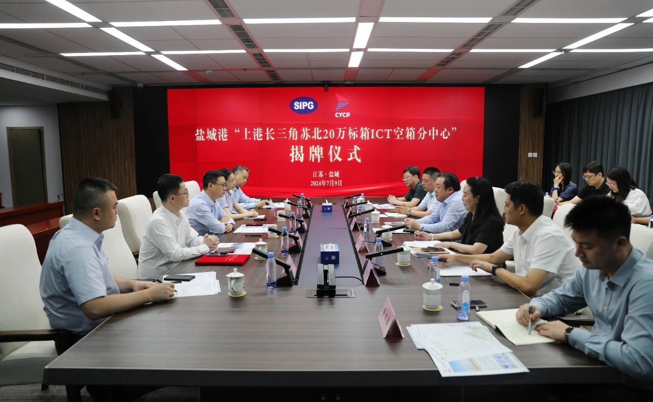 7月9日,鹽城港“上港長三角ICT蘇北空箱分中心”揭牌儀式成功舉行。集團(tuán)黨委書記、董事長周正雄,上港集團(tuán)長三角公司總經(jīng)理陳偉出席活動(dòng)并為中心揭牌。集團(tuán)副總經(jīng)理袁欣,上港集團(tuán)長三角公司、航運(yùn)集團(tuán)相關(guān)負(fù)責(zé)同志及貨主企業(yè)代表等參加。