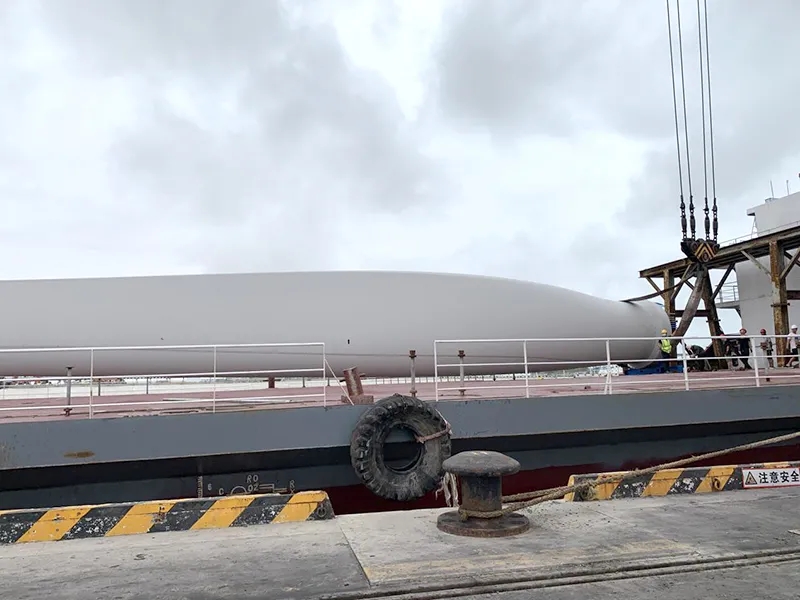 據(jù)悉,此次2套大型風(fēng)電葉片采用門座式起重機(jī)的作業(yè)方式裝卸,風(fēng)電葉片各長71.4米,兩套總重達(dá)280噸,該批次風(fēng)電葉片將從濱海港區(qū)裝船啟運(yùn)至浙江岱山機(jī)位項(xiàng)目處。