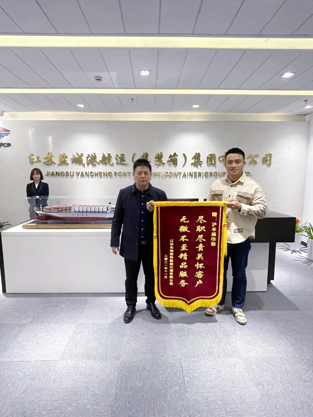 11月12日,江蘇長海國際船舶代理有限公司業(yè)務(wù)經(jīng)理吳長春一行拜訪江蘇滬豐集裝箱物流有限公司,將一面寫有“盡職盡責(zé)關(guān)懷客戶,無微不至精品服務(wù)”的錦旗送到滬豐公司,對(duì)滬豐公司操作部近年來提供的優(yōu)質(zhì)高效服務(wù)表示感謝。