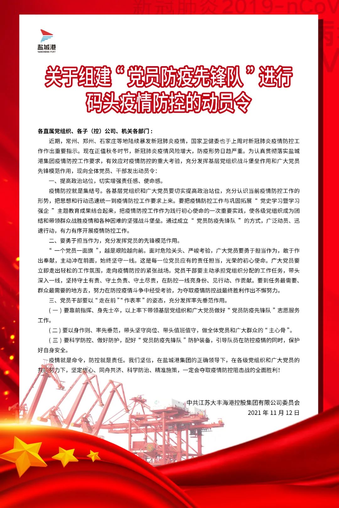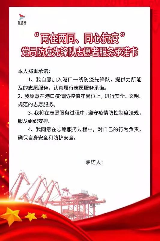 “我自愿加入港口一線黨員防疫先鋒隊,提供力所能及的志愿服務……”11月15日,由大豐港區(qū)、航運(集裝箱)集團64名黨員組成的防疫先鋒隊向黨旗作出鄭重承諾。面對當前疫情反復的形勢,鹽城港大豐港區(qū)積極響應“兩在兩同””建新功行動號召,嚴格貫徹落實鹽城港集團疫情防控工作要求,以“50天大比武”活動為契機,充分發(fā)揮“我是黨員,向我看齊”的先鋒模范作用,讓黨旗飄揚在疫情防控最前線,確保港口生產(chǎn)、防疫“兩手抓、兩不誤”。