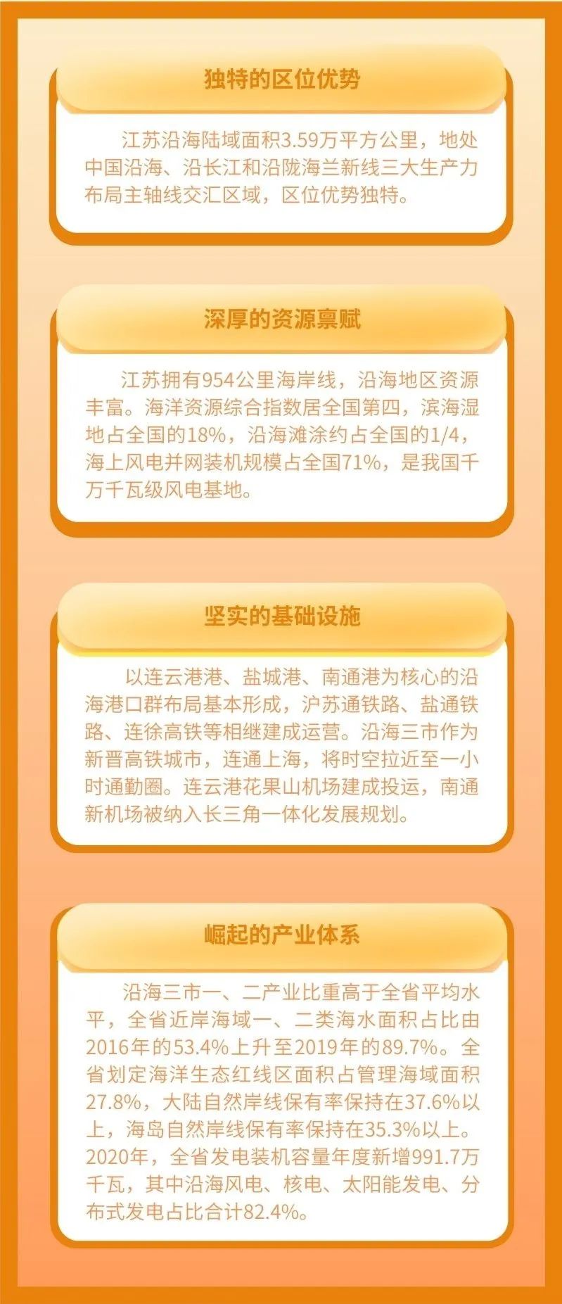 江蘇“十四五”規(guī)劃綱要明確,沿海地區(qū)深化港產(chǎn)城融合發(fā)展,著力提升海洋經(jīng)濟(jì)、生態(tài)經(jīng)濟(jì)和樞紐經(jīng)濟(jì),打造令人向往的生態(tài)風(fēng)光帶、人海和諧的藍(lán)色經(jīng)濟(jì)帶,成為新的增長極。江蘇省第十四次黨代會(huì)提出,全力推進(jìn)沿海地區(qū)高質(zhì)量發(fā)展,加快陸海統(tǒng)籌發(fā)展,大力發(fā)展海洋經(jīng)濟(jì),著力塑造“繽紛百里”“生態(tài)百里”“藍(lán)灣百里”濱海特色風(fēng)貌,努力把沿海地區(qū)打造成綠色生態(tài)高質(zhì)量發(fā)展經(jīng)濟(jì)帶。