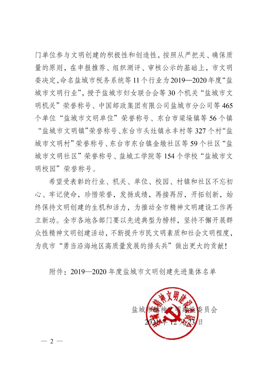 12月23日,鹽城市精神文明建設委員會發(fā)布《關于命名表彰2019-2020年度鹽城市文明創(chuàng)建先進集體的決定》,集團榮獲2019-2020年度“鹽城市文明單位”榮譽稱號。