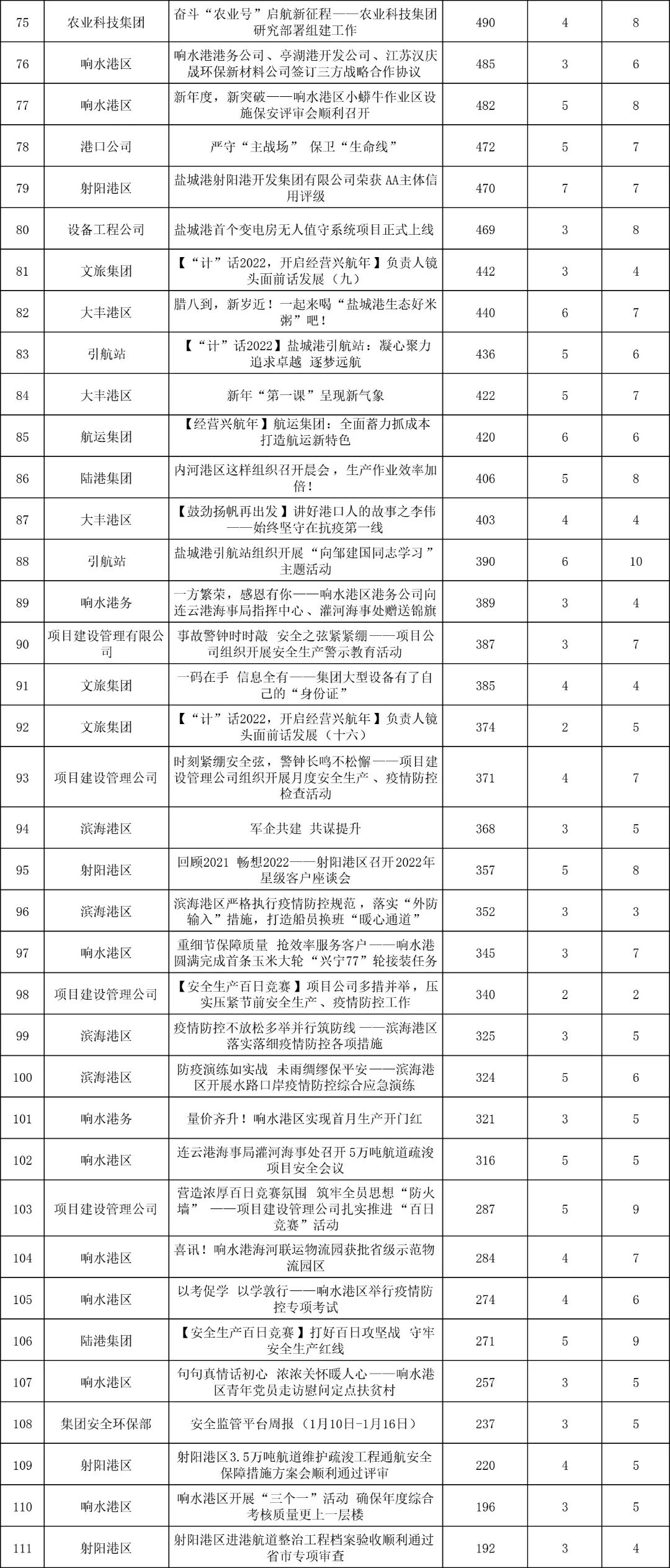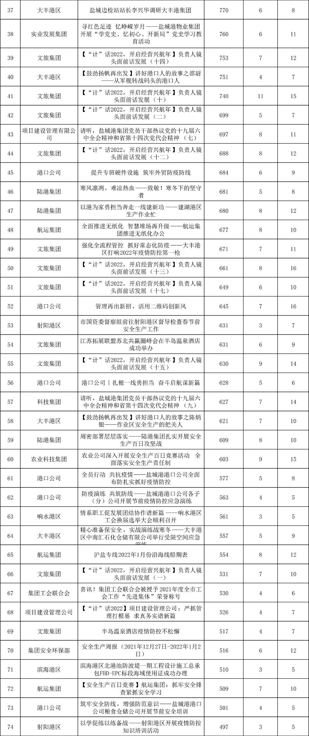 1月,“江蘇鹽城港控股集團”微信公眾號推送文章170篇,截至目前,閱讀總量14萬+,各單位供稿111篇。其中,文旅集團以2.1萬閱讀數(shù),24篇稿件量,遙遙領先;大豐港區(qū)以1.8萬閱讀數(shù),16篇稿件量,位列第二;港口公司、響水港區(qū)在供稿方面,以同樣13篇的數(shù)量并列第三,在閱讀量方面,港口公司以1.2萬的數(shù)量,位列單項第三;其他港口及板塊集團積極參與,踴躍投稿,情況較好。