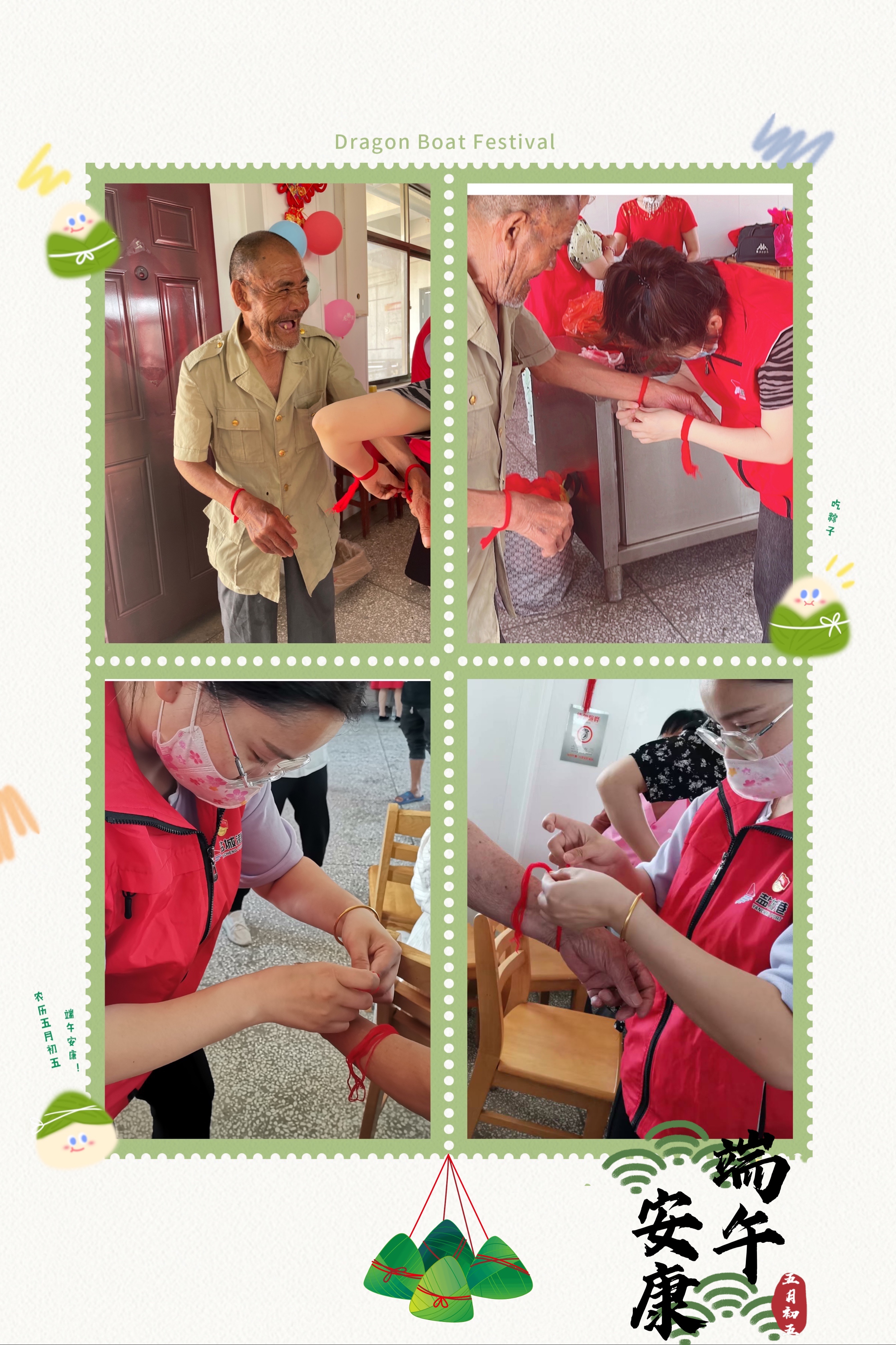 粽子飄香,絲線傳情。志愿者們?yōu)楝F(xiàn)場老人系紅線送祝福。老人們開心的像個小大孩,爭相比著自己的紅線繩,現(xiàn)場一片歡聲笑語?!耙荒暌欢宋?,一歲一安康,艾葉飄香,紅線捆扎,串起港城間的和諧幸?!?。