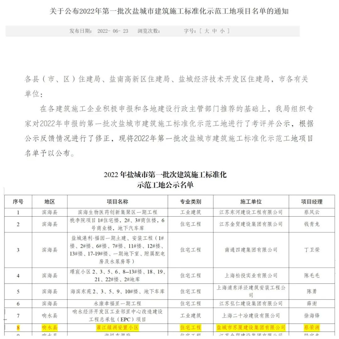 日前,江蘇省鹽城市住房和城鄉(xiāng)建設(shè)局公布2022年第一批次鹽城市建筑施工標(biāo)準(zhǔn)化示范工地項(xiàng)目名單,由項(xiàng)目管理公司代管的響水縣灌江綠洲安置小區(qū)項(xiàng)目榮獲“鹽城市建筑施工標(biāo)準(zhǔn)化示范工地”稱(chēng)號(hào)。