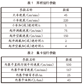 堆場仿真參數(shù):2.1 堆場布局參數(shù)港口裝卸作業(yè)區(qū)布置2個10萬噸級泊位,每個泊位配備3臺岸橋,總計6臺岸橋,編號分別為Crane 1、Crane 2、Crane 3、Crane 4、Crane 5、Crane 6。港口堆場作業(yè)區(qū)規(guī)劃有4個箱區(qū),編號分別為E01、E02、E03、E04。在堆場布置方面,E01箱區(qū)為近海側箱區(qū),E04箱區(qū)為近陸側箱區(qū),E01、E02箱區(qū)為出口箱區(qū),E03、E04箱區(qū)為進口箱區(qū)。在港口堆場作業(yè)區(qū)規(guī)劃中,將E01箱區(qū)設置為9列5層箱區(qū),E02、E03、E04箱區(qū)設置為12排5層箱區(qū),每個箱區(qū)配備有2臺場橋協(xié)同作業(yè),總計8臺場橋,編號分別為A01、A02、A03、A04、A05、A06、A07、A08。2.2 堆場設備參數(shù)港口堆場作業(yè)設備主要包括場橋、岸橋、集卡等,上述設備的運行參數(shù)即為堆場仿真系統(tǒng)的輸入?yún)?shù)。根據(jù)實際集裝箱堆場作業(yè)數(shù)據(jù),對作業(yè)設備進行參數(shù)設置。岸橋運行參數(shù)見表1,集卡運行參數(shù)見表2,場橋運行參數(shù)見表3。