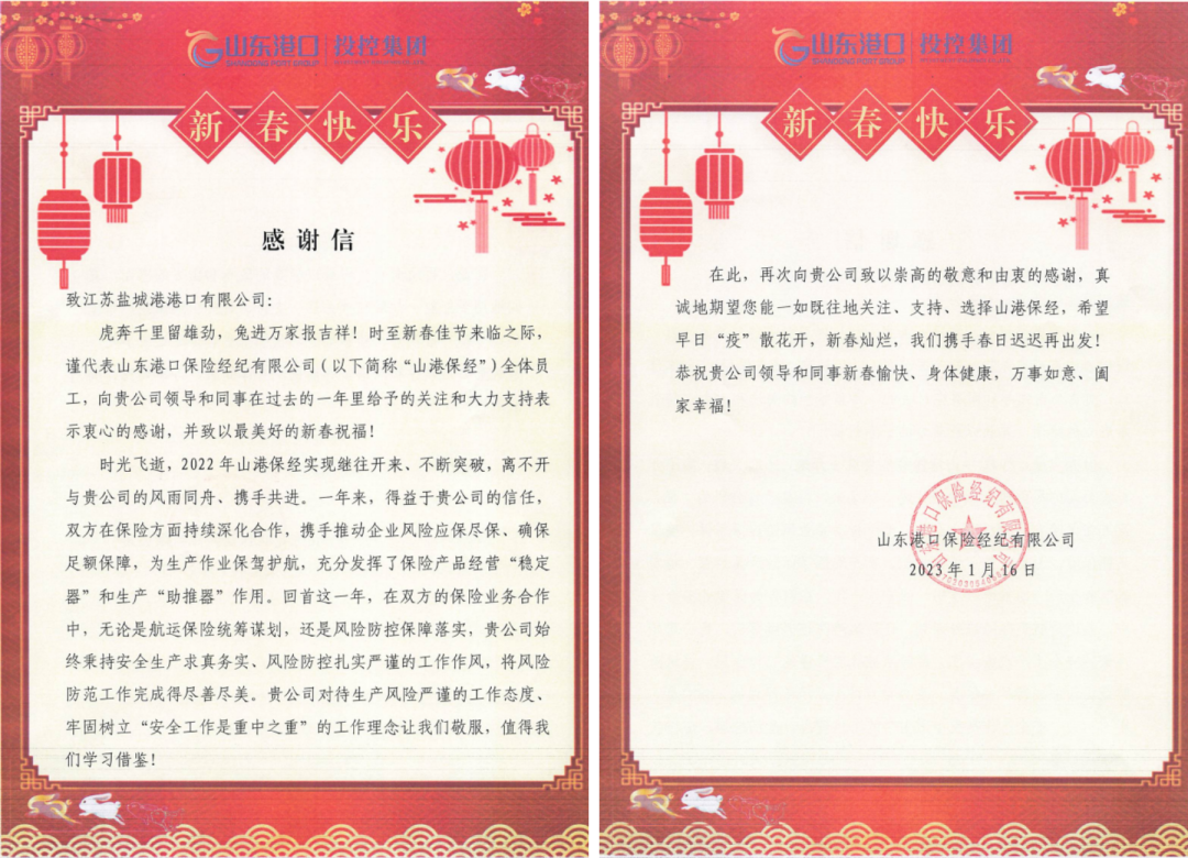 新歲序開,同赴新程。近日,集團下屬江蘇鹽城港大豐港開發(fā)集團、江蘇鹽城港港口公司、江蘇鹽城港航運集團三家單位分別收到來自山東港口保險經(jīng)紀(jì)公司的感謝信。紙短情長,字字暖心。一封封感謝信,道出了鹽城港和山東港攜手發(fā)展的深厚情誼。