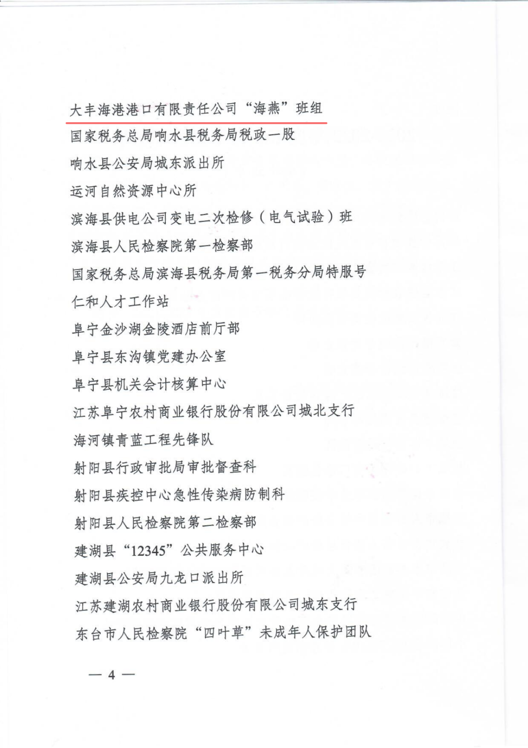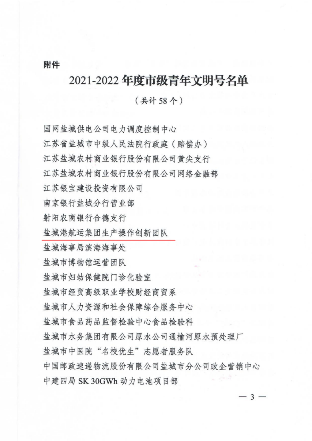 近日,共青團(tuán)鹽城市委發(fā)布《關(guān)于命名2021-2022年度市級青年文明號的決定》,鹽城港航運集團(tuán)生產(chǎn)操作創(chuàng)新團(tuán)隊、大豐海港港口有限責(zé)任公司“海燕”班組以優(yōu)異的表現(xiàn)榮獲“2021-2022年度市級青年文明號”稱號。