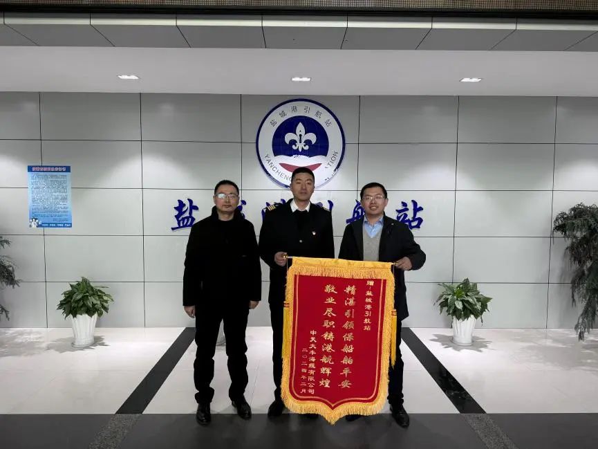 鹽城港引航站收到江蘇鹽城港智慧港口有限公司、中天大豐海纜有限公司、鹽城捷順船舶代理有限公司的三面錦旗