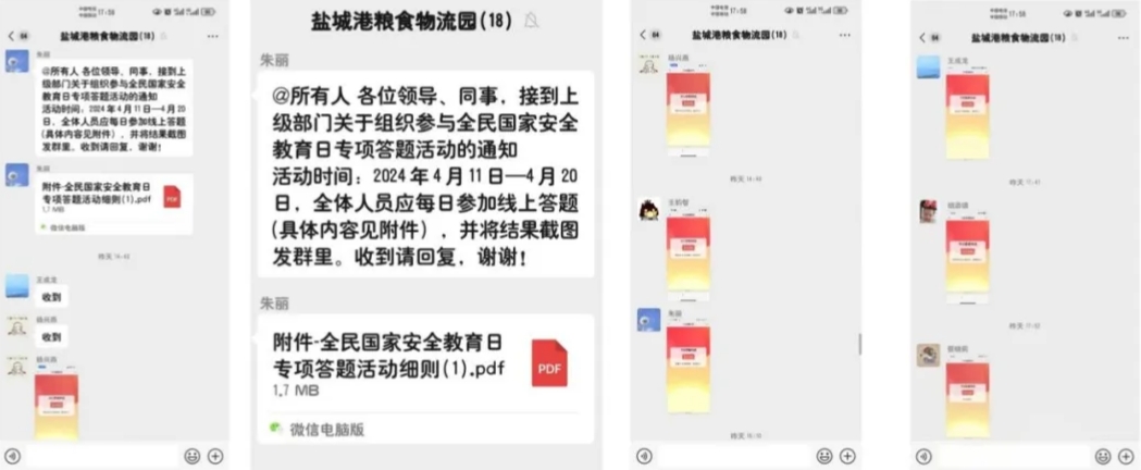 線上利用公司微信群、黨員學(xué)習(xí)微信群發(fā)送學(xué)習(xí)資料,全方位、多角度宣傳國家安全知識,進(jìn)一步增強(qiáng)“國家安全無小事”的觀念和意識。