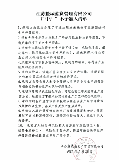 (三)加強(qiáng)風(fēng)險(xiǎn)源頭管控,制定不予準(zhǔn)入清單,出租的廠房須滿(mǎn)足承租項(xiàng)目安全生產(chǎn)需求,違反規(guī)定改變廠房使用性質(zhì)、不符合工程建設(shè)安全標(biāo)準(zhǔn)的不得出租;承租項(xiàng)目必須符合產(chǎn)業(yè)政策和安全要求,存在突出風(fēng)險(xiǎn)相互疊加或重大事故隱患未按規(guī)定整改等問(wèn)題的要堅(jiān)決清退,不具備安全生產(chǎn)條件以及明令淘汰、限制類(lèi)項(xiàng)目不得租賃廠房進(jìn)行生產(chǎn)。不予準(zhǔn)入清單報(bào)屬地監(jiān)管部門(mén)審核。