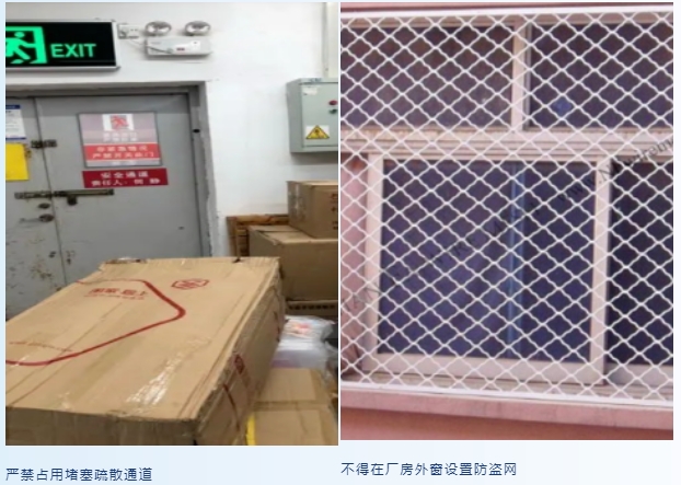 (十五)嚴(yán)禁占用堵塞疏散通道、安全出口,不得在廠房外窗設(shè)置鐵柵欄、防盜網(wǎng)。