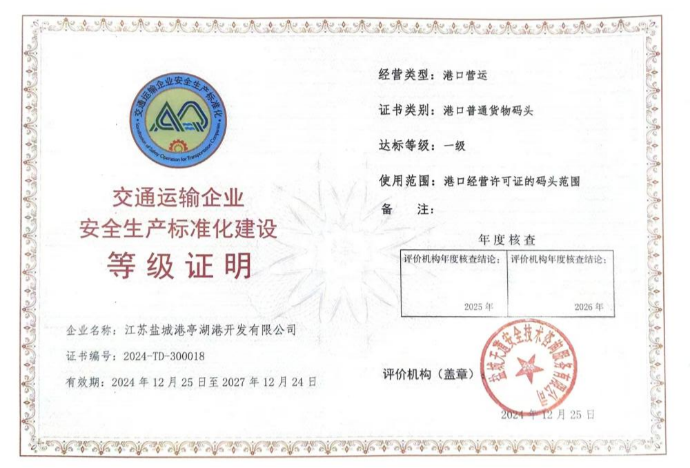 近日,陸港集團(tuán)亭湖港區(qū)順利通過(guò)交通運(yùn)輸企業(yè)安全生產(chǎn)一級(jí)標(biāo)準(zhǔn)化驗(yàn)收,并取得一級(jí)標(biāo)準(zhǔn)化認(rèn)證證書(shū)。這標(biāo)志著陸港集團(tuán)在內(nèi)河港區(qū)安全生產(chǎn)管理方面邁上新臺(tái)階。