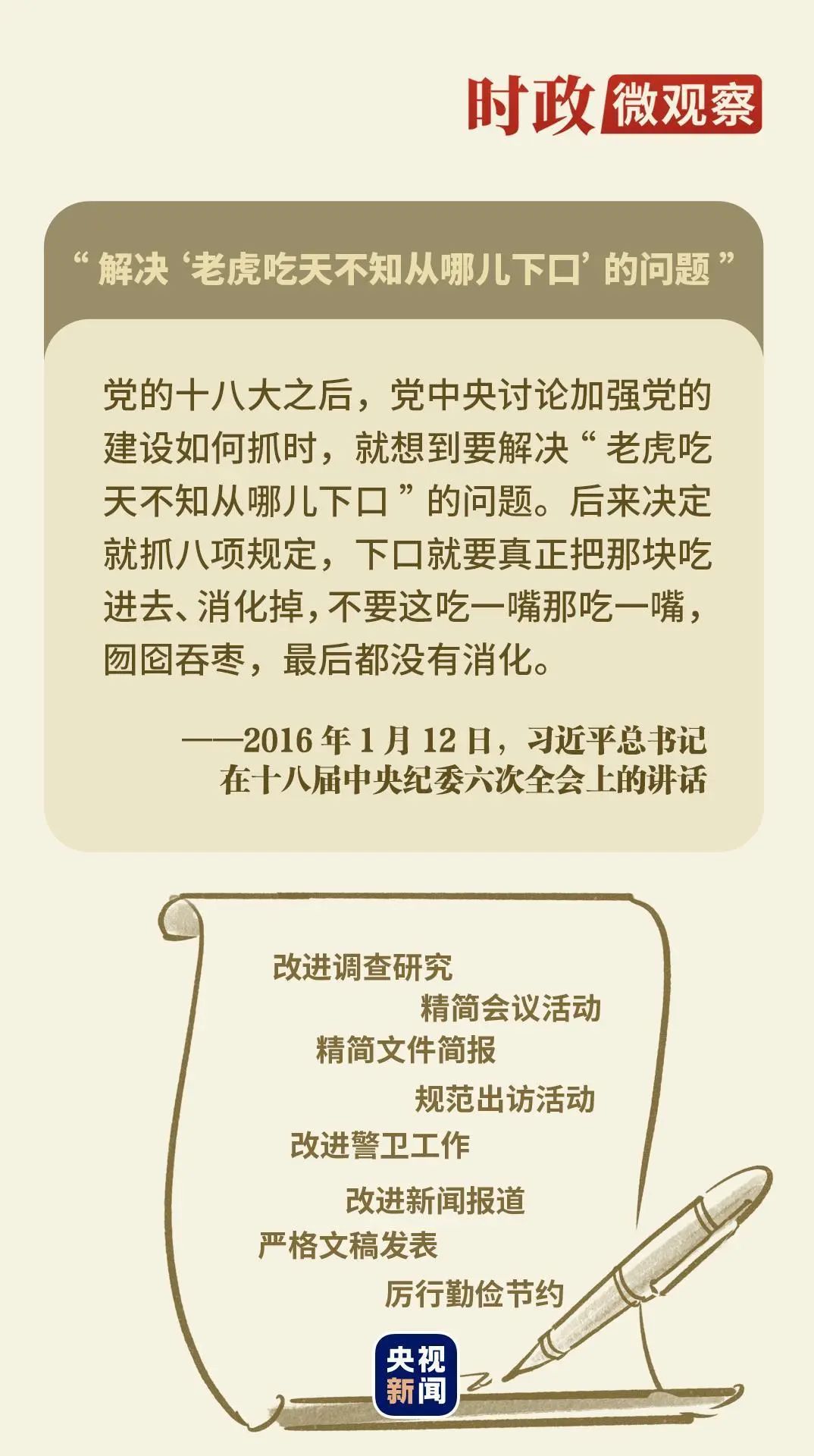 《時(shí)政微觀察》選取習(xí)近平總書記關(guān)于中央八項(xiàng)規(guī)定的生動(dòng)論述,闡明其中深意。