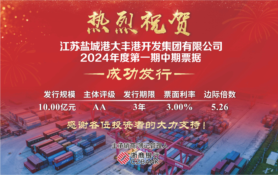 2024年4月22日,大豐港開發(fā)集團(tuán)2024年度第一期中期票據(jù)成功發(fā)行,本期債券發(fā)行規(guī)模10億元,發(fā)行期限3年,票面利率3%,邊際5.26倍,創(chuàng)大豐港開發(fā)集團(tuán)債券發(fā)行利率歷史新低。