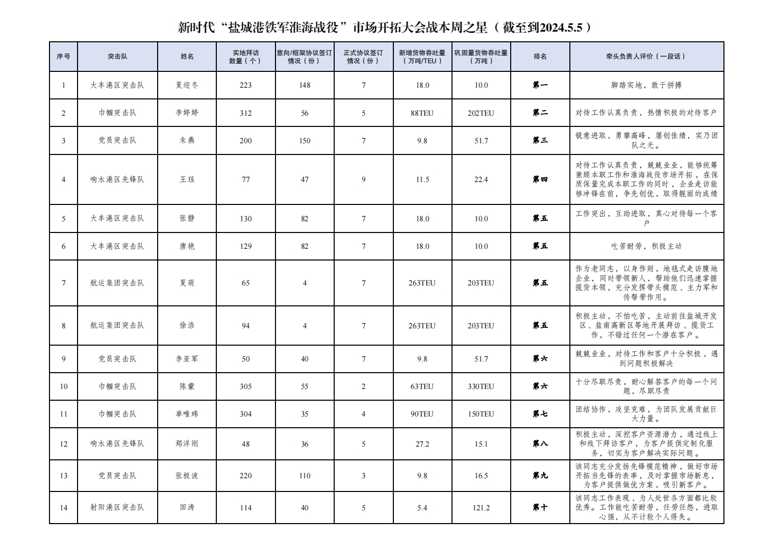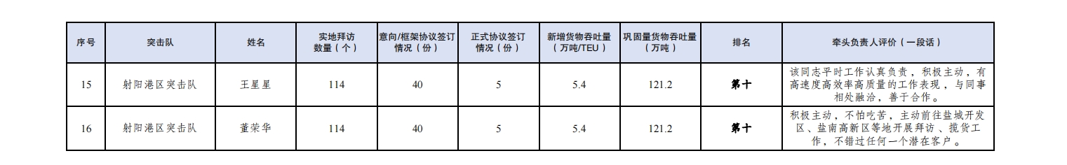 第一名:大豐港區(qū)突擊隊(duì) 夏迎冬(拜訪客戶223家,簽訂意向協(xié)議148份,簽訂正式協(xié)議7份,新增貨物吞吐量18萬噸,鞏固量貨物吞吐量10萬噸);