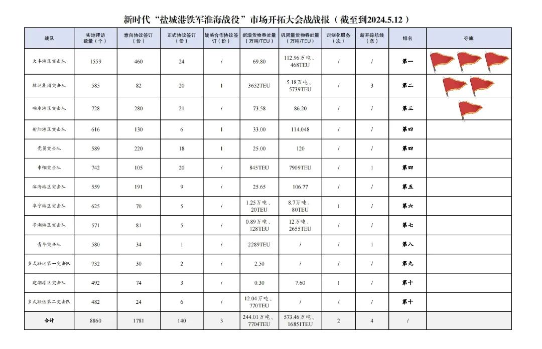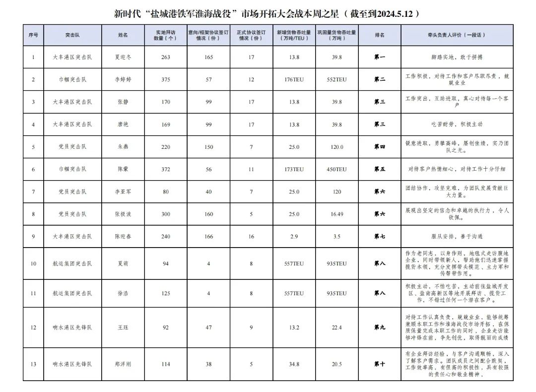 1.累計拜訪客戶數量8860家:其中大豐港區(qū)突擊隊1559家,巾幗突擊隊742家,多式聯(lián)運第一突擊隊732家,響水港區(qū)突擊隊728家,阜寧港區(qū)突擊隊625家,射陽港區(qū)突擊隊616家,黨員突擊隊589家,航運集團突擊隊585家,青年突擊隊580家,亭湖港區(qū)突擊隊571家,濱海港區(qū)突擊隊559家,建湖港區(qū)突擊隊492家,多式聯(lián)運第二突擊隊482家。