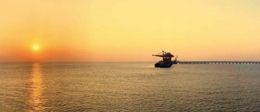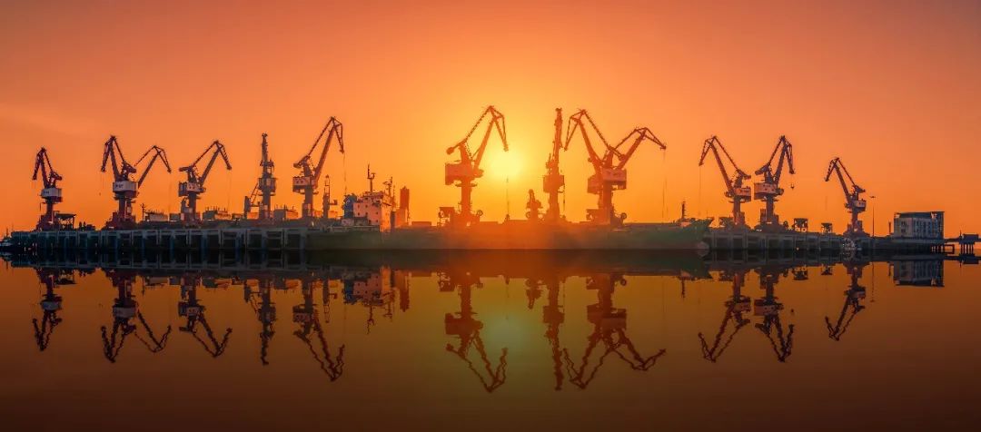 海平面上,太陽(yáng)冉冉升起,映紅了海面和天空,照耀著海港的迷人和神奇,新興和璀璨。