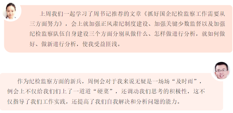 紀檢監(jiān)察業(yè)務周例會是大豐港區(qū)提高紀檢條線工作能力的方式,也是建設學習型紀檢干部的有效嘗試?!皩W習要有干貨,不能搞花架子,要了解我們的干部最需要學什么,緊貼實際需求和工作要求來安排學習內容?!贝筘S港區(qū)紀檢相關負責人表示,深化監(jiān)察體制改革,對紀檢監(jiān)察干部的業(yè)務能力提出了更高更嚴的要求,學習就是要著力補短板、強弱項,解決紀檢監(jiān)察干部本領“恐慌”問題。例會上,就集團紀委下發(fā)文件精神進行剖析、對日常監(jiān)督如何抓、信息宣傳選題立意、特色亮點提煉歸納進行培訓。會上還提倡“我的問題大家答”,組織交流討論、現(xiàn)場解答,鼓勵善于發(fā)現(xiàn)問題,積極解決問題,創(chuàng)新理念思路,確??梢浴俺潆娧a能”,提升業(yè)務能力。