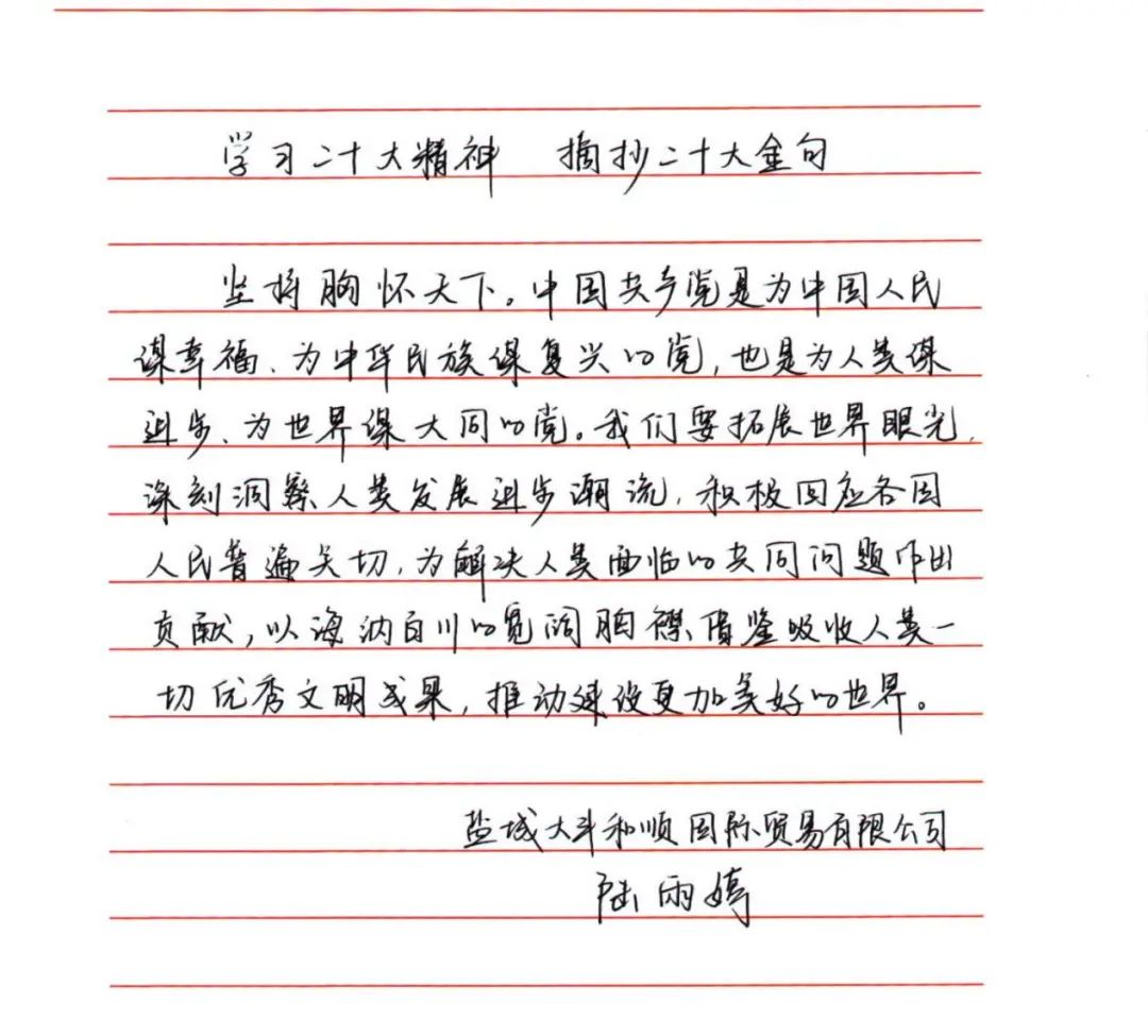 為深入學(xué)習(xí)宣傳貫徹黨的二十大精神,切實把思想和行動統(tǒng)一到黨的二十大精神上來,使黨員干部做到“學(xué)原文、悟原理、知原義”。近日,江蘇大豐港和順科技股份公司黨支部組織開展手抄黨的二十大報告“金句”活動,黨員干部積極參加、以筆抒懷,用特別的方式書寫對黨的赤誠忠心。