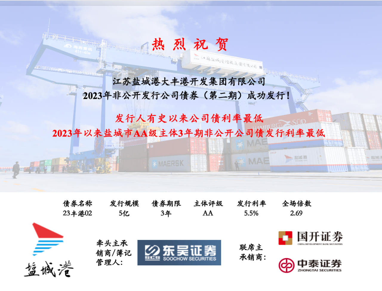 6月14日,在鹽城港集團(tuán)成立三周年之際,大豐港開發(fā)集團(tuán)2023年面向?qū)I(yè)投資者非公開發(fā)行公司債券(私募公司債券第二期)簿記成功。本期債券發(fā)行規(guī)模5億元,期限3年,票面利率5.5%,全場認(rèn)購倍數(shù)2.69倍,創(chuàng)下大豐港開發(fā)集團(tuán)私募公司債券利率歷史最低紀(jì)錄。