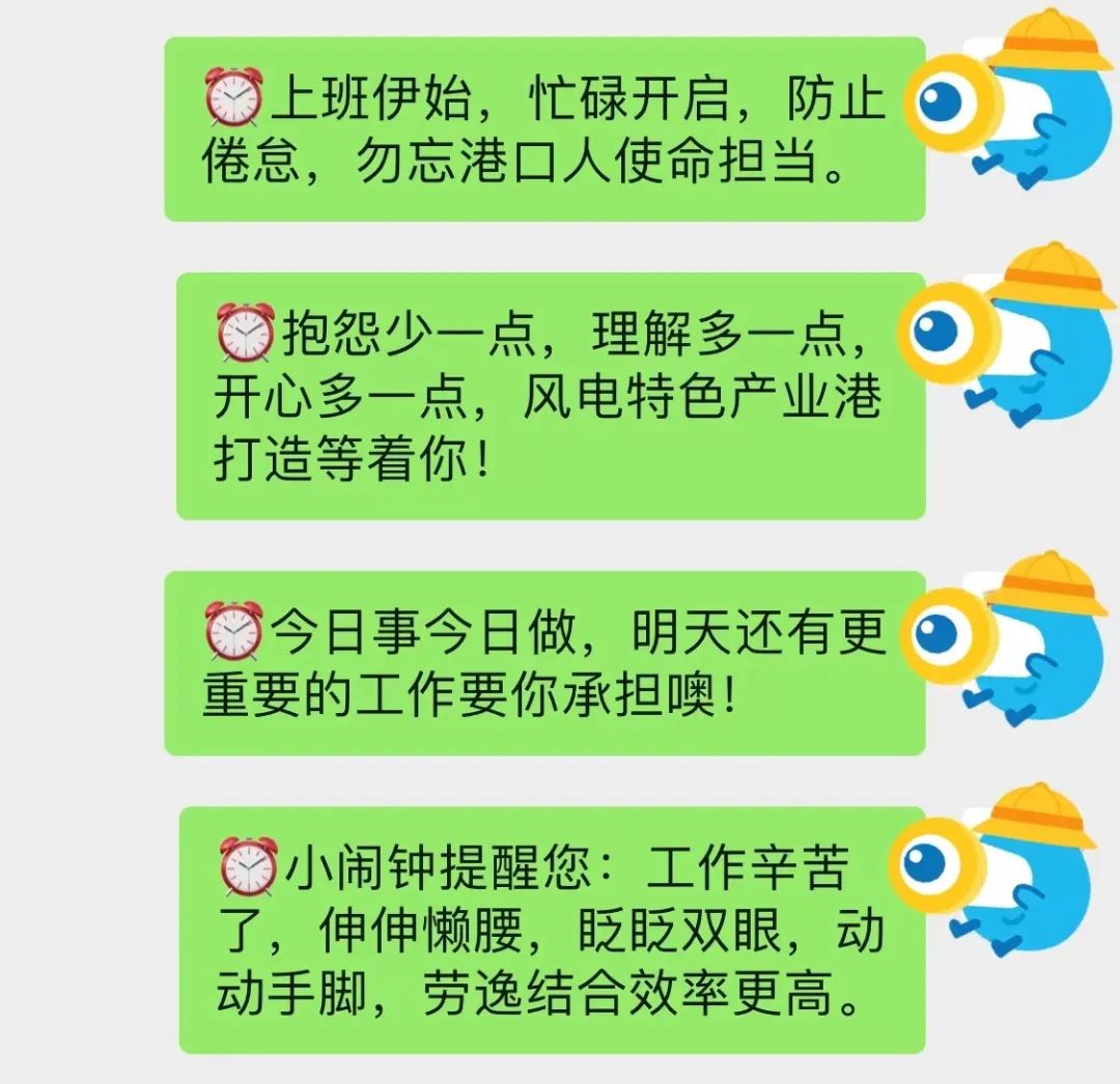叮鈴鈴,“上班伊始,忙碌開啟,防止倦怠,勿忘港口人使命擔(dān)當(dāng)。”每天一上班,打開電腦,首先彈出上述信息。這是射陽港區(qū)新增設(shè)的辦公“鬧鐘小貼士”的管家信息。提醒各位員工,作為鹽城港人,要時刻不忘肩負(fù)的“架起鹽城走向世界海上大通道”時代使命,必須時刻保持永不懈怠、奮發(fā)拼搏的精神狀態(tài),做好自己的本職工作。