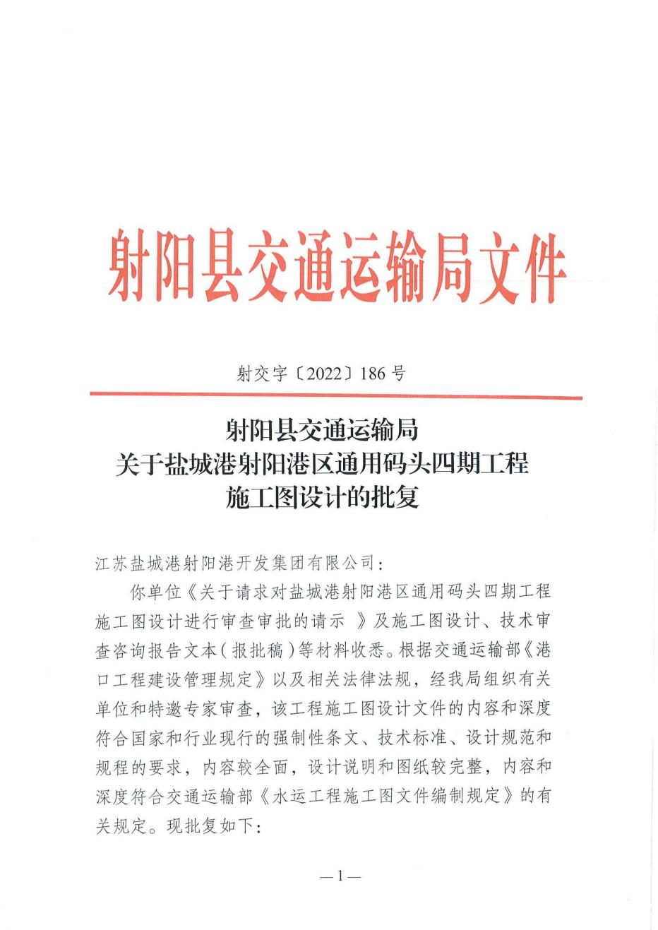 8月30日,鹽城港射陽(yáng)港區(qū)通用碼頭四期工程項(xiàng)目初步設(shè)計(jì)和施工圖設(shè)計(jì)取得正式批復(fù)。至此,該項(xiàng)目已完成所有前期手續(xù),為項(xiàng)目的正式開(kāi)工奠定了堅(jiān)實(shí)的基礎(chǔ)。