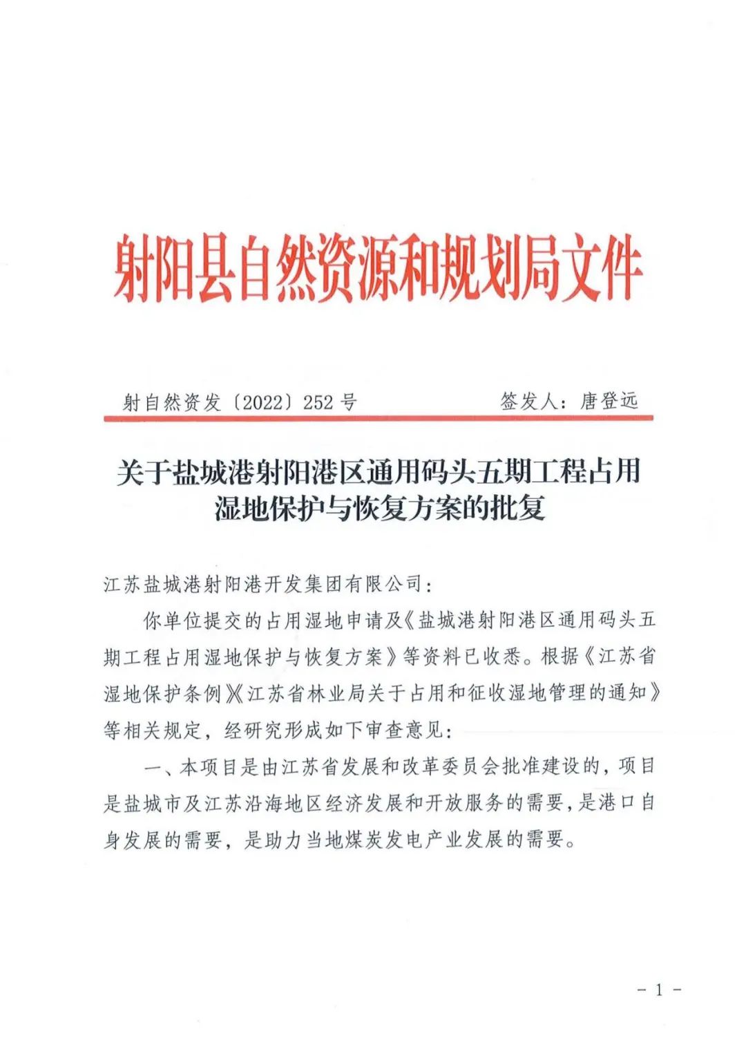 10月25日,鹽城港射陽(yáng)港區(qū)通用碼頭五期工程占用濕地保護(hù)與恢復(fù)方案取得射陽(yáng)縣自然資源和規(guī)劃局正式批復(fù),至此,該項(xiàng)目已完成包括備案、穩(wěn)評(píng)、岸線批復(fù)等多項(xiàng)前期手續(xù)辦理,為加快推進(jìn)該項(xiàng)目的正式開(kāi)工奠定了堅(jiān)實(shí)基礎(chǔ)。