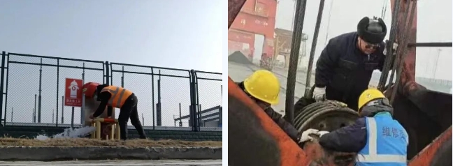 針對(duì)突發(fā)大幅降溫狀況,港區(qū)立即組織“四防”安全專項(xiàng)檢查,在碼頭現(xiàn)場(chǎng)著重檢查高大設(shè)備防風(fēng)、室外管線防凍、機(jī)械運(yùn)行防寒、車輛人員防滑等防范措施的落實(shí)和各崗位人員冬季勞保用品規(guī)范的配備,保障各項(xiàng)防寒潮措施落地生根;同時(shí)檢查了現(xiàn)場(chǎng)應(yīng)急物資儲(chǔ)備,確保防滑沙、融雪劑、除雪工具等數(shù)量充足,存放規(guī)范。