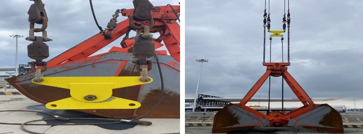 日常門機散貨裝卸過程中,鋼絲繩受失重影響大幅甩動致相鄰鋼絲繩纏繞,產(chǎn)生劇烈摩擦,影響起重機械的工作效率,最終導致捻距被破壞。設備班組總結、創(chuàng)新制作門機主鋼絲繩平衡防纏繞裝置,在門機開閉兩根鋼絲繩的兩端和抓斗鋼絲繩的兩端,用卸扣豎向連接,橫向支撐、縱向承載,杜絕鋼絲繩纏繞,延長使用壽命,確保設備高效運轉。