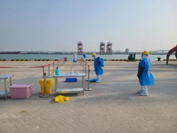 本次演練模擬了濱海港區(qū)通用碼頭2號泊位發(fā)現(xiàn)疫情之后的相關(guān)處置流程。演練中,碼頭發(fā)現(xiàn)疫情后,及時將情況進(jìn)行上報,并立即停止作業(yè),同時迅速對登船人員進(jìn)行排查,就地隔離,開展現(xiàn)場消殺工作?,F(xiàn)場成立疫情防控應(yīng)急指揮部,按照指揮部的統(tǒng)一調(diào)度,開展應(yīng)急處置,經(jīng)過妥善處理,演練中的疫情得到有效控制,同時對碼頭作業(yè)人員嚴(yán)格執(zhí)行“N+7+7”的閉環(huán)管理,確保濱海港區(qū)碼頭盡快恢復(fù)正常生產(chǎn)。