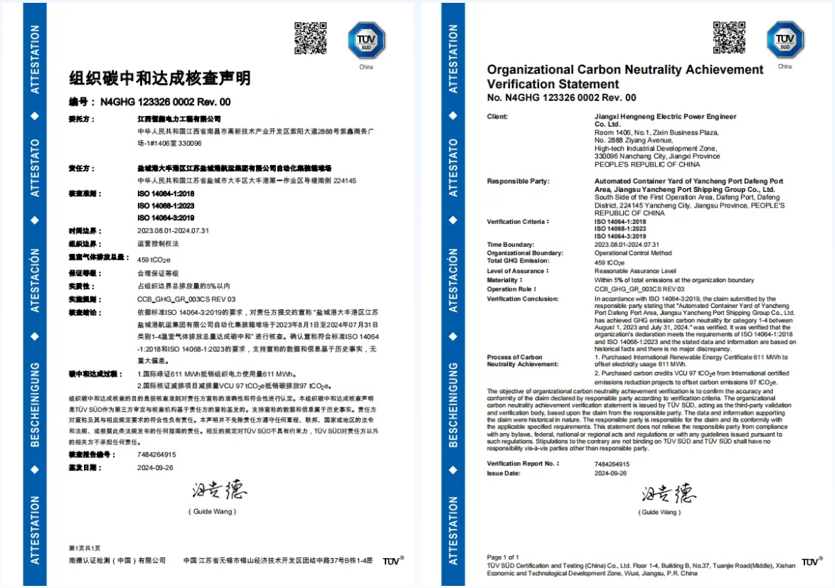 9月26日,鹽城港大豐港區(qū)江蘇鹽城港航運集團有限公司自動化集裝箱堆場獲得TUV南德意志集團頒發(fā)的《組織碳中和達成核查聲明》,成為國內(nèi)首個獲得“碳中和”認證的堆場項目(TUV南德意志集團成立于1866年,總部位于德國慕尼黑,是世界上規(guī)模最大、最古老的TUV檢驗機構)。這是繼2023年鹽城港自動化集裝箱堆場獲得碳中和承諾審定以來,鹽城港在落實國家“雙碳”目標,積極推動港口綠色低碳發(fā)展,奮力為鹽城勇當全省發(fā)展新質(zhì)生產(chǎn)力重要陣地“碳路先鋒”做出的又一項重要實踐。