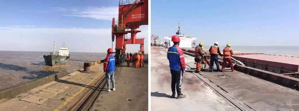 碼頭前沿,進(jìn)行船舶靠泊系纜作業(yè)