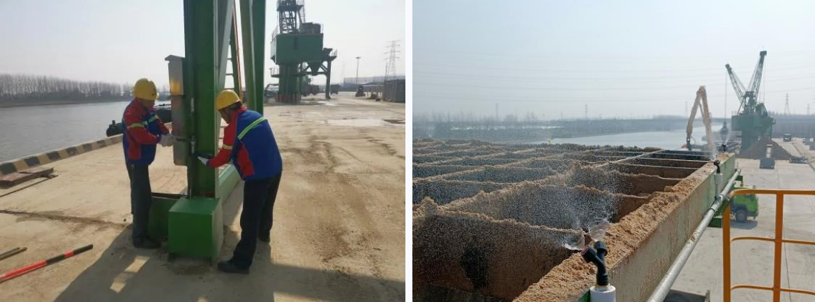 港機(jī)公司通過在設(shè)備上加裝高性能微霧裝置和圓錐形高壓微霧噴頭,來感應(yīng)固定吊抓斗移動,當(dāng)抓斗靠近料斗時(shí)觸發(fā)距離傳感器,系統(tǒng)自動打開噴霧,從而減少物料裝卸過程中的揚(yáng)塵,實(shí)現(xiàn)散貨作業(yè)抑塵自動化。