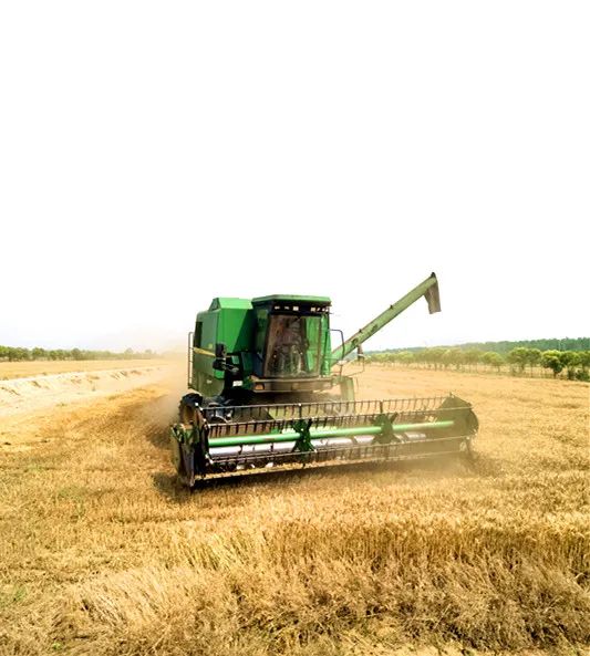 烈日下,收割機在麥田里穿梭,伴著隆隆機聲,飽滿的麥穗被吞進脫粒箱,運輸車將金黃色的麥粒運到倉庫,田間一派繁忙景象。