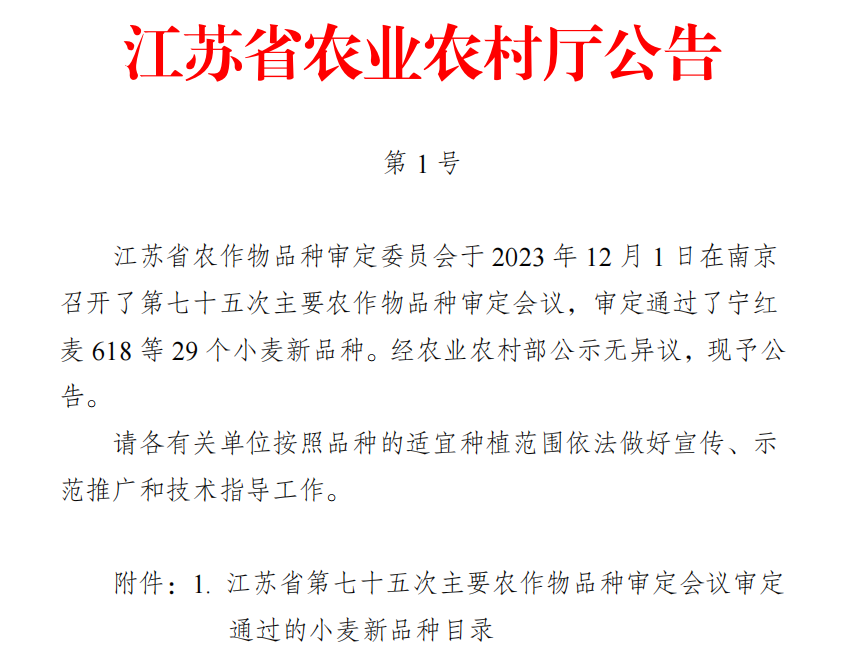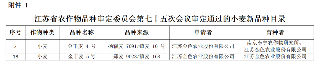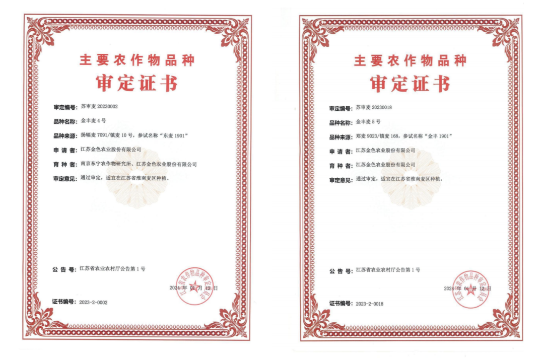 近日,農(nóng)業(yè)科技集團(tuán)所屬金色農(nóng)業(yè)自主選育的“金豐麥4號(hào)”“金豐麥5號(hào)”兩個(gè)小麥品種順利通過江蘇省主要農(nóng)作物品種審定,并完成公示程序。這是繼2019年-2023年期間獲審的“金豐麥1、2、3號(hào)”后,又一批通過審定的小麥品種,至此,農(nóng)業(yè)科技集團(tuán)形成具有自主品種權(quán)的“金豐麥”品系。