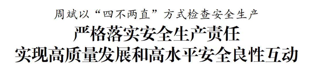 8月5日下午,市委書記周斌以“四不兩直”方式檢查安全生產工作。他強調,要深入貫徹黨的二十屆三中全會精神和習近平總書記關于安全生產的重要論述,堅持人民至上、生命至上,嚴格落實安全生產責任,扎實開展安全隱患排查整治,全力補齊安全領域短板弱項,以“時時放心不下”的責任感和“事事心中有底”的行動力,統(tǒng)籌好發(fā)展和安全,努力實現(xiàn)高質量發(fā)展和高水平安全良性互動。
