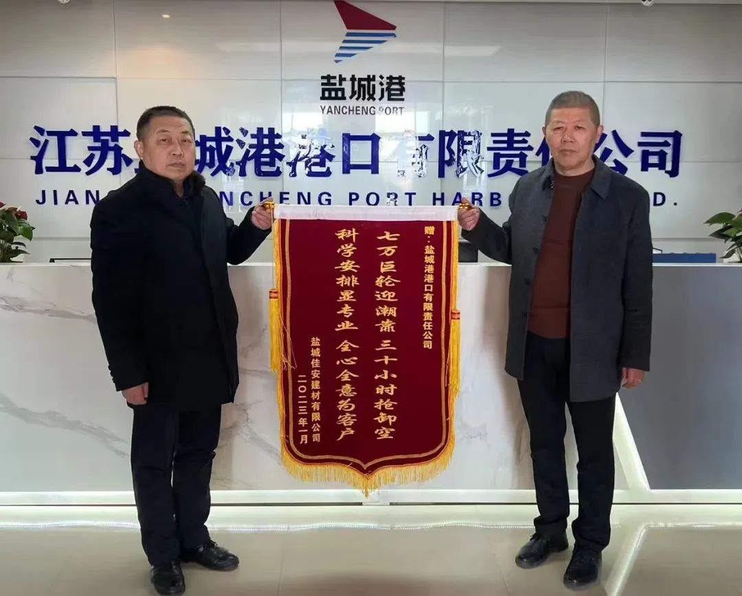 兔年伊始,鹽城港港口公司收到鹽城佳安建材有限公司贈(zèng)送的錦旗,對(duì)港口公司所提供的優(yōu)質(zhì)裝卸服務(wù)表示感謝。