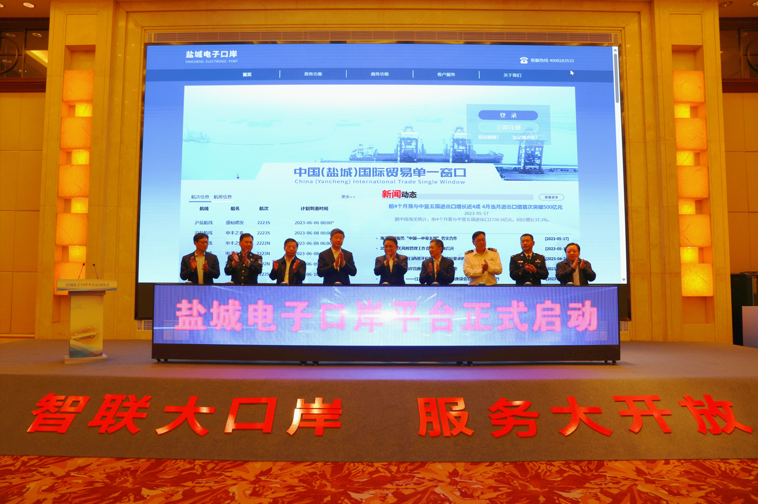 5月18日,鹽城電子口岸平臺啟動儀式成功舉行。副市長唐敬出席會議并講話。鹽城港集團黨委書記、董事長周正雄,市商務(wù)局局長、口岸辦主任郭慶生,鹽城海關(guān)黨委書記、關(guān)長吳志明參加并分別致辭。鹽城海事局局長程欣、鹽城機場出入境邊防檢查站站長邵紅軍、鹽城出入境邊防檢查站站長李興華、鹽城南洋國際機場有限責(zé)任公司董事長劉志軍等參加。市政府副秘書長張波主持活動。