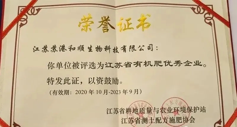 2020年10月16日,大豐港集團(tuán)新能源板塊旗下江蘇蘇港和順生物科技有限公司被江蘇省耕地質(zhì)量與農(nóng)業(yè)環(huán)境保護(hù)協(xié)會和江蘇省測土配方施肥協(xié)會聯(lián)合評為“江蘇省有機(jī)肥料優(yōu)秀企業(yè)”。