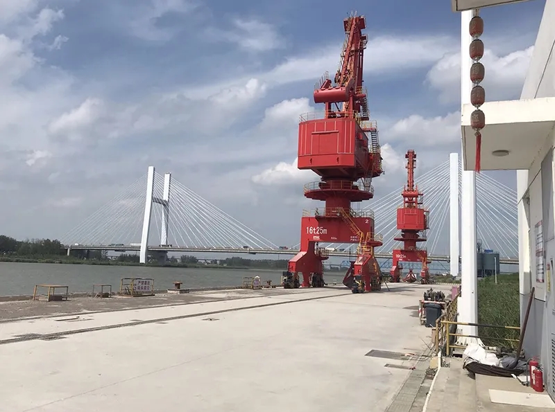 碼頭工程建設(shè)規(guī)模為4個(gè)1000噸級通用泊位(水工結(jié)構(gòu)按靠泊3000噸級船舶設(shè)計(jì))。碼頭泊位長度324米。結(jié)構(gòu)設(shè)計(jì)船型為3000t級江海直達(dá)貨船,設(shè)計(jì)代表船型為1000噸級散雜貨船,兼顧船型為1拖+3×1000噸級船和500噸級散雜貨船。設(shè)計(jì)年吞吐量180萬噸,年通過能力194萬噸。1#、3#、4#泊位各配置1臺16t-20m低門架門座式起重機(jī)(臺架吊),2#泊位設(shè)置1臺裝船機(jī)及斜槽輸送系統(tǒng)。