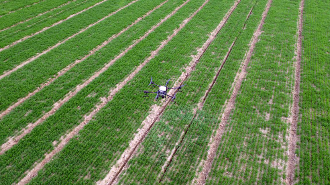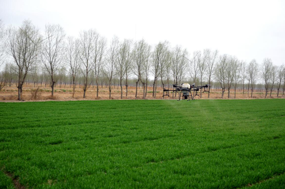 在田間的一頭,華豐公司的植保無人機(jī)“飛手”正在進(jìn)行“飛防”作業(yè),確保了農(nóng)田生產(chǎn)安全,相比傳統(tǒng)人工打藥防治,每畝地的勞動力、藥品成本可降低45%。