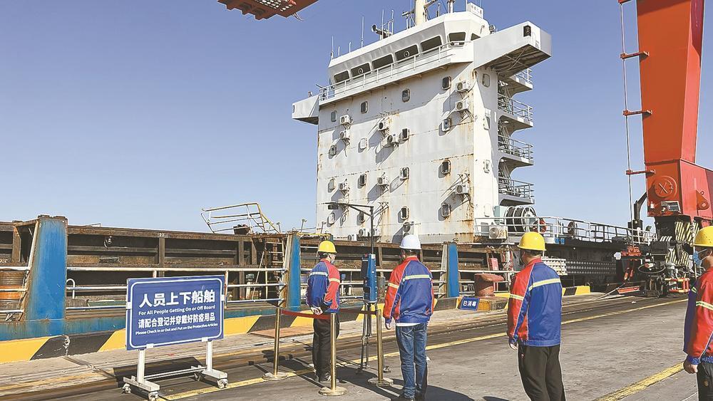 4月28日中午11時(shí),在鹽城邊檢站大豐港駐地,一艘裝有55000噸硫磺的馬紹爾群島籍艾迪輪緩緩進(jìn)港靠泊。此時(shí),在船舶梯口前,大豐海港港口有限責(zé)任公司30名碼頭工人,身著白色防護(hù)服頭戴安全帽,正在一臺約2.5米高的電子設(shè)備前排隊(duì),準(zhǔn)備核驗(yàn)身份后登輪。