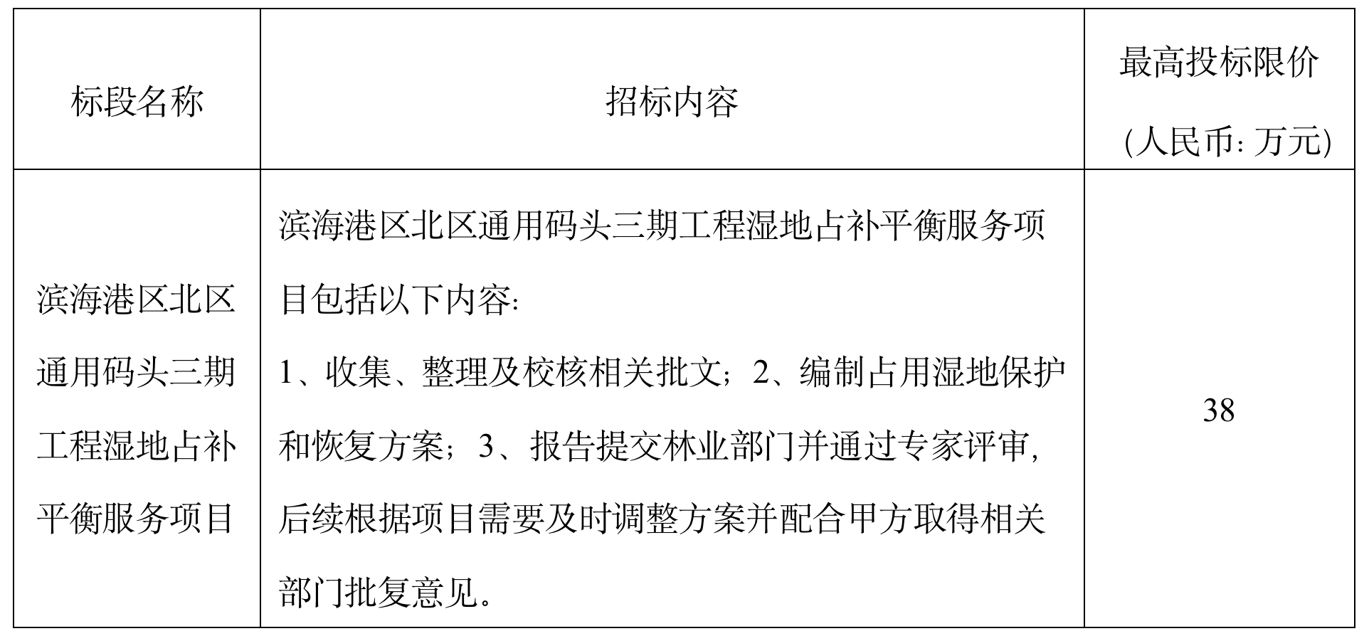 (5)項目標(biāo)段劃分:濱海港區(qū)北區(qū)通用碼頭三期工程濕地占補(bǔ)平衡服務(wù)項目共劃分1個標(biāo)段,標(biāo)段信息如下: