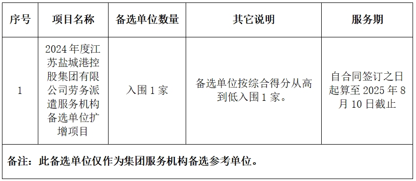2024年度江蘇鹽城港控股集團(tuán)有限公司勞務(wù)派遣服務(wù)機(jī)構(gòu)備選單位擴(kuò)增項(xiàng)目,招標(biāo)人為江蘇鹽城港控股集團(tuán)有限公司,受招標(biāo)人委托,江蘇鹽城港項(xiàng)目建設(shè)管理咨詢有限公司作為招標(biāo)代理對(duì)本項(xiàng)目進(jìn)行公開招標(biāo),資格后審。